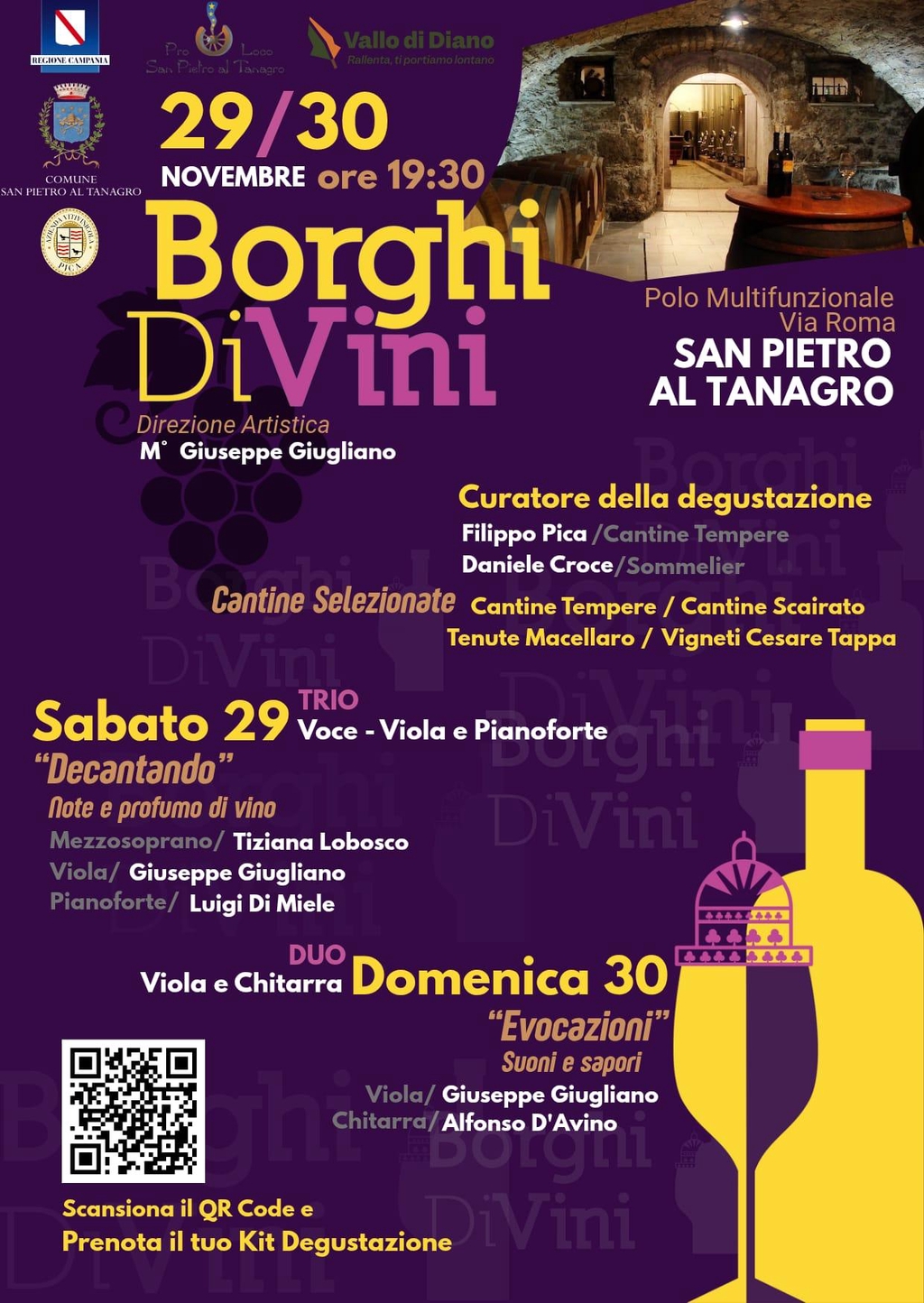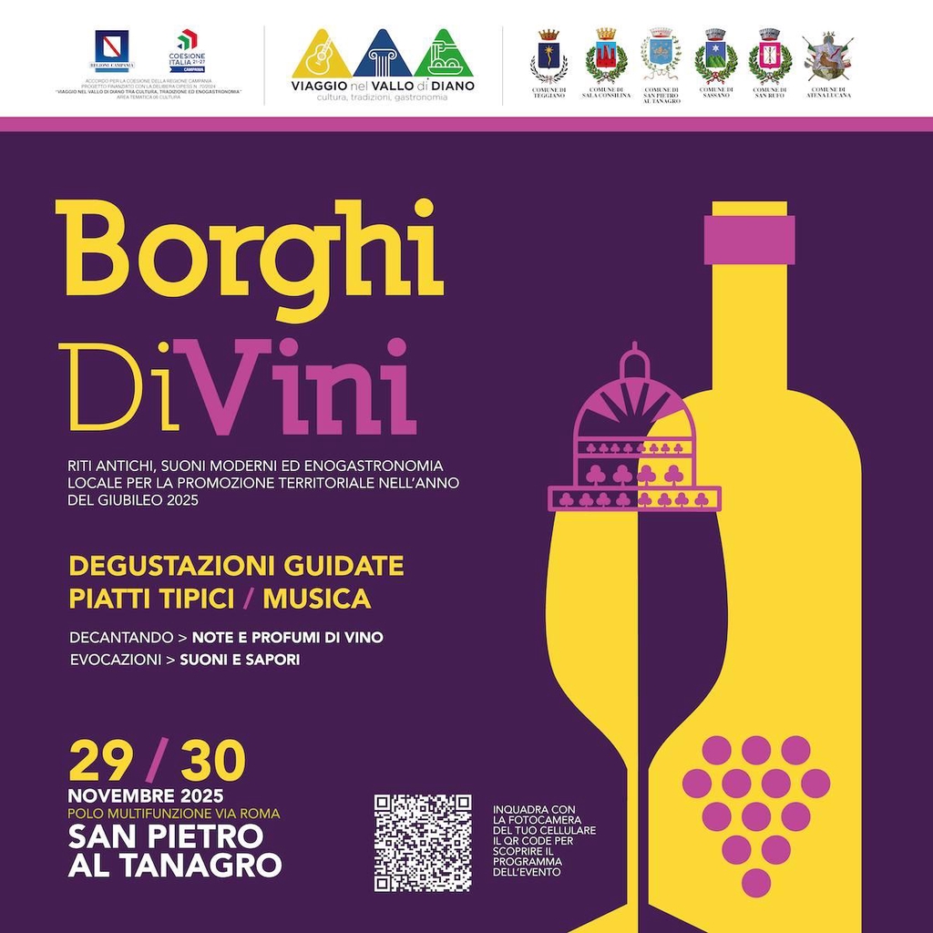 La musica, così come il buon vino, accompagna da sempre l’uomo nei suoi riti di comunità: profumi, suoni e racconti che attraversano il tempo e tornano a vivere nei nostri borghi. Borghi DiVini è un’esperienza sensoriale in due serate, un brindisi d’autunno che unisce tradizione e innovazione nell’anno del Giubileo 2025, per valorizzare i sapori autentici di San Pietro al Tanagro e di tutto il Vallo di Diano.